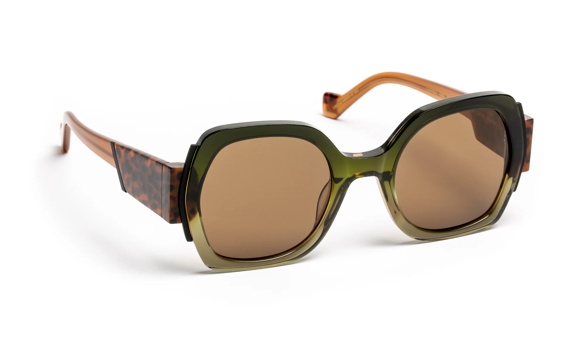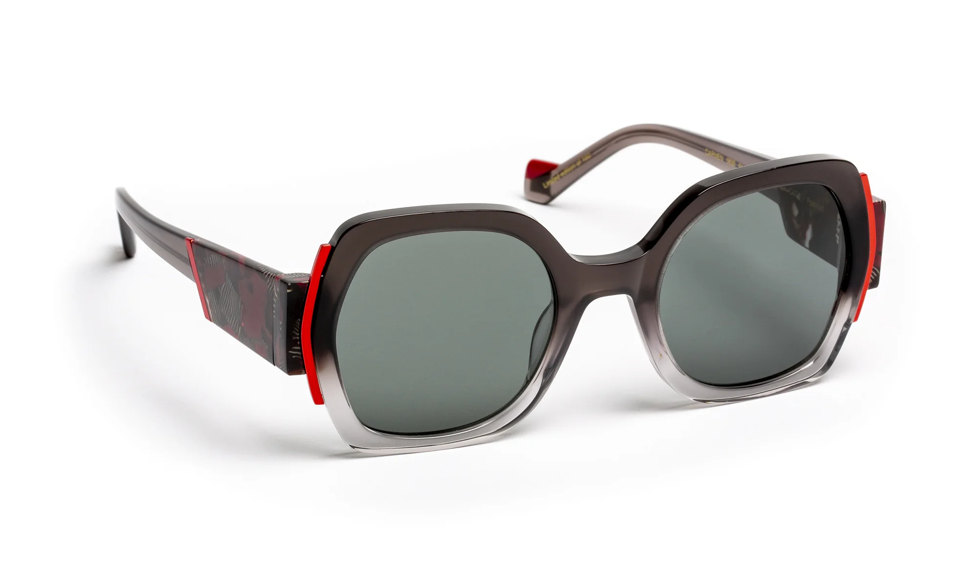 Sophisticated acetate sunglasses, sublimated by an entirely hand-crafted faceted finish. Its wide, delicately hollowed temples catch the light and reveal subtle reflections for a contemporary, assertive look. The translucent gradient color palette plays on transparency and depth, creating changing light effects that illuminate the face.