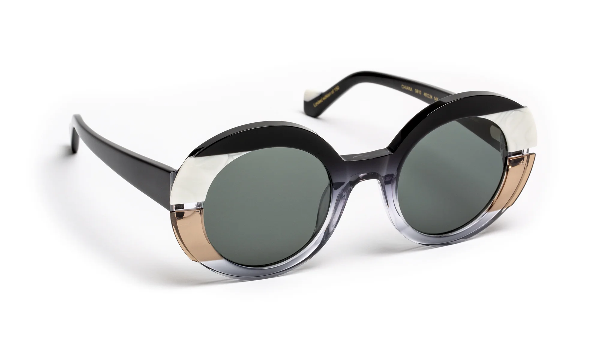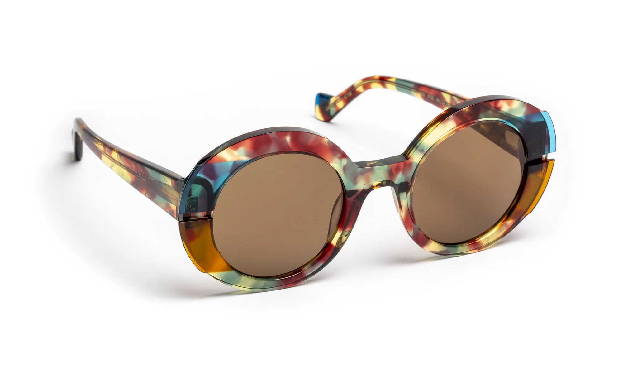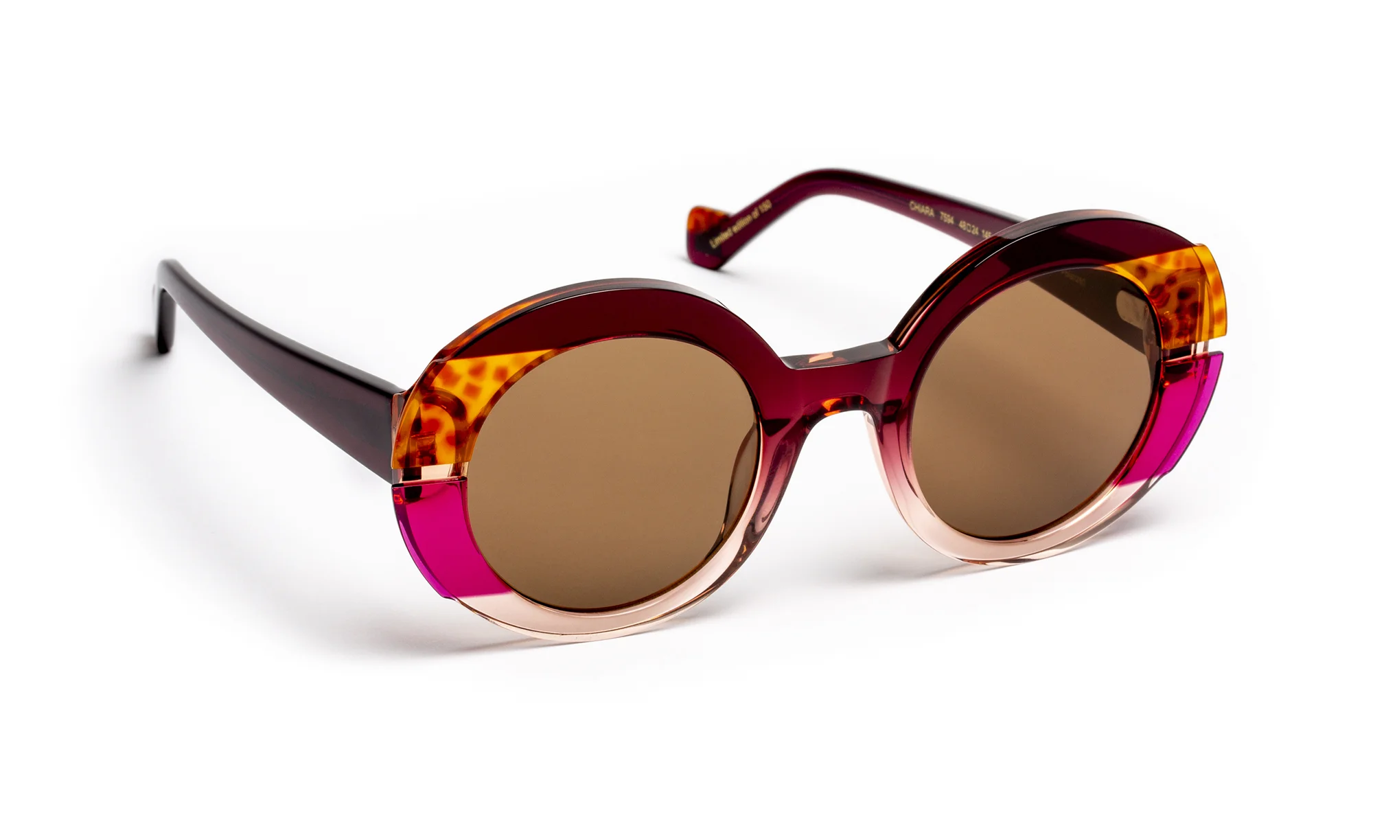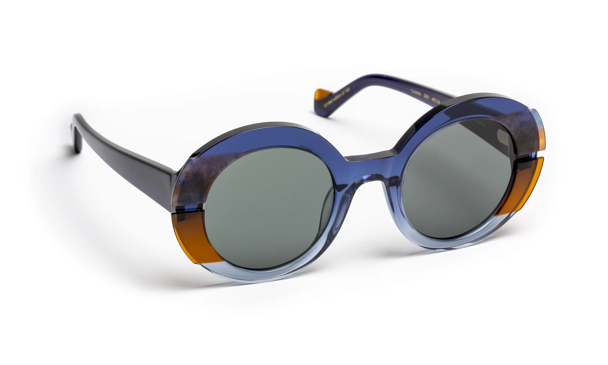 Designed to sublimate light, this model explores transparency and color through meticulous acetate work. The face, enriched with two lateral laminations, composes a subtle play of superimpositions where the horizontal milling elegantly captures and diffuses light.