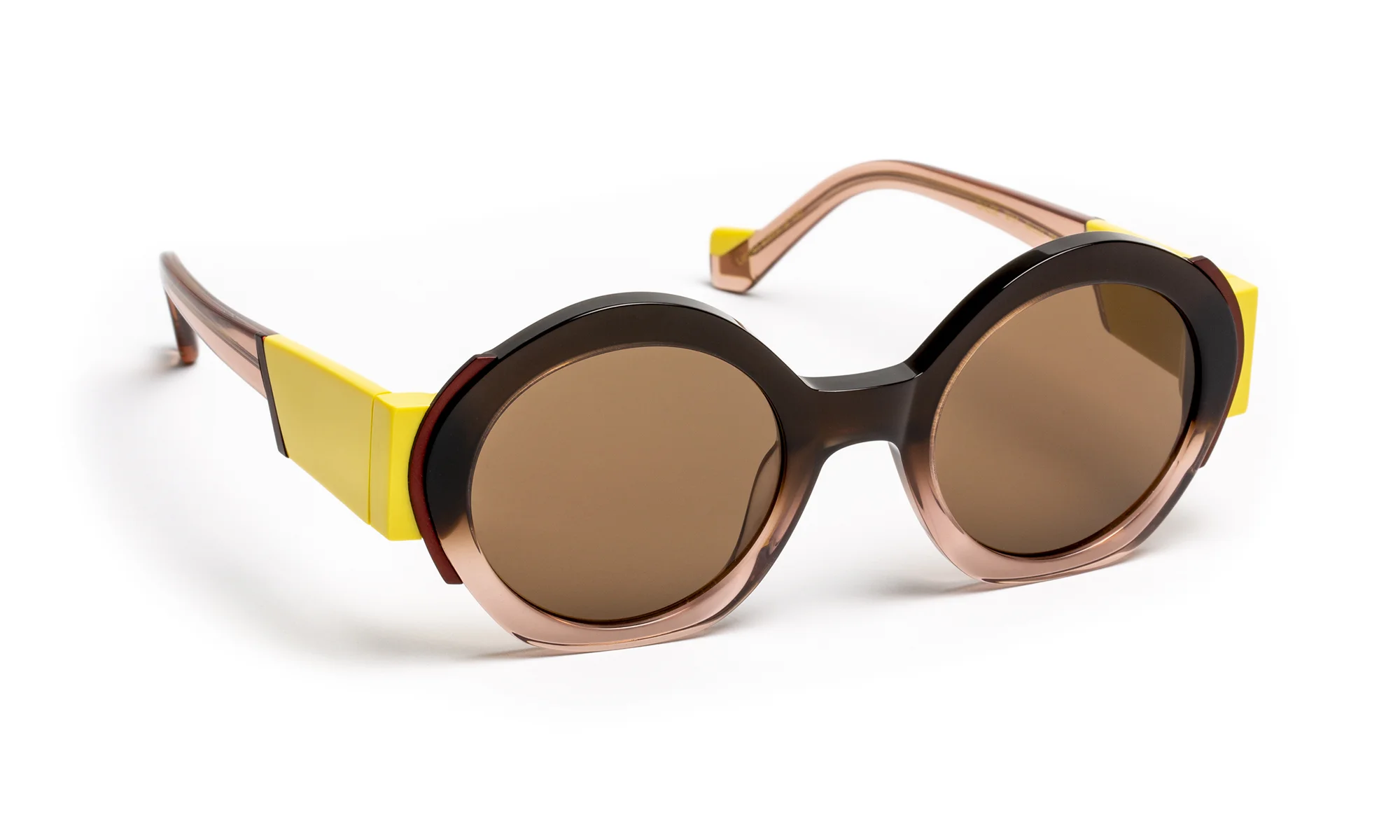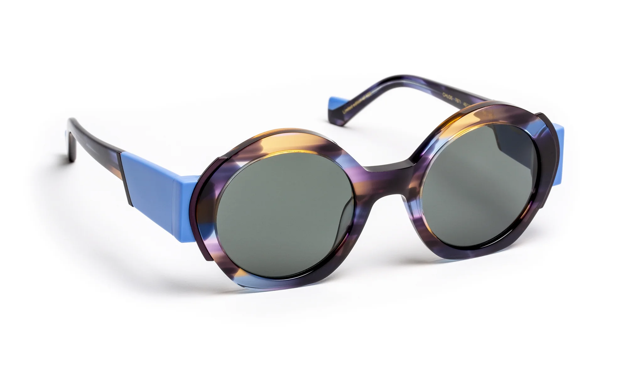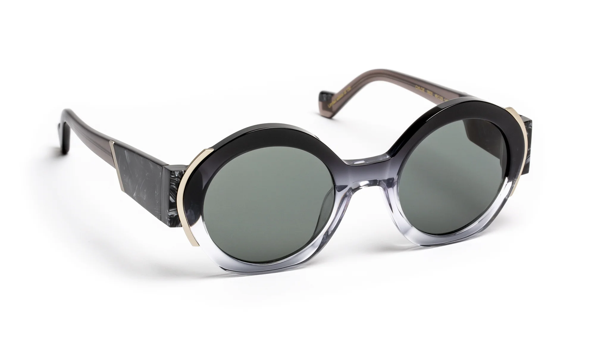 Sophisticated acetate sunglasses, sublimated by an entirely hand-crafted faceted finish. Its wide, delicately hollowed temples catch the light and reveal subtle reflections for a contemporary, assertive look. The translucent gradient color palette plays on transparency and depth, creating changing light effects that illuminate the face.