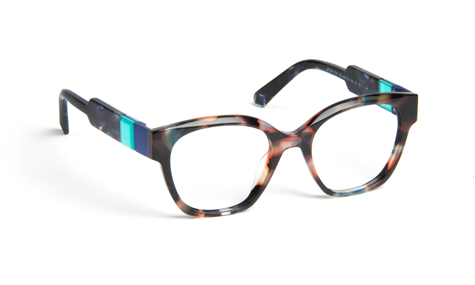 JF1598 is a glossy acetate frame for both front and temples, featuring a bold geometric design. The temples incorporate a duo of decorative squares combining metal and beveled acetate. The colors are expressive and luminous, with warm “sunset” gradients, bold chromatic contrasts, and marbled acetates revisiting classic tortoiseshell. The overall palette is balanced by transparent tones that bring lightness and modernity.
