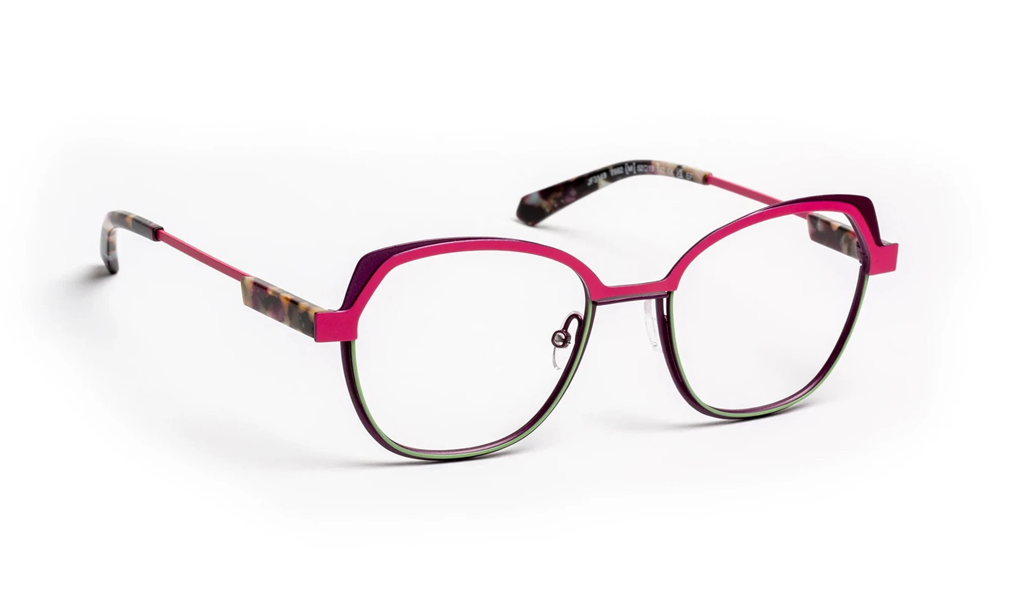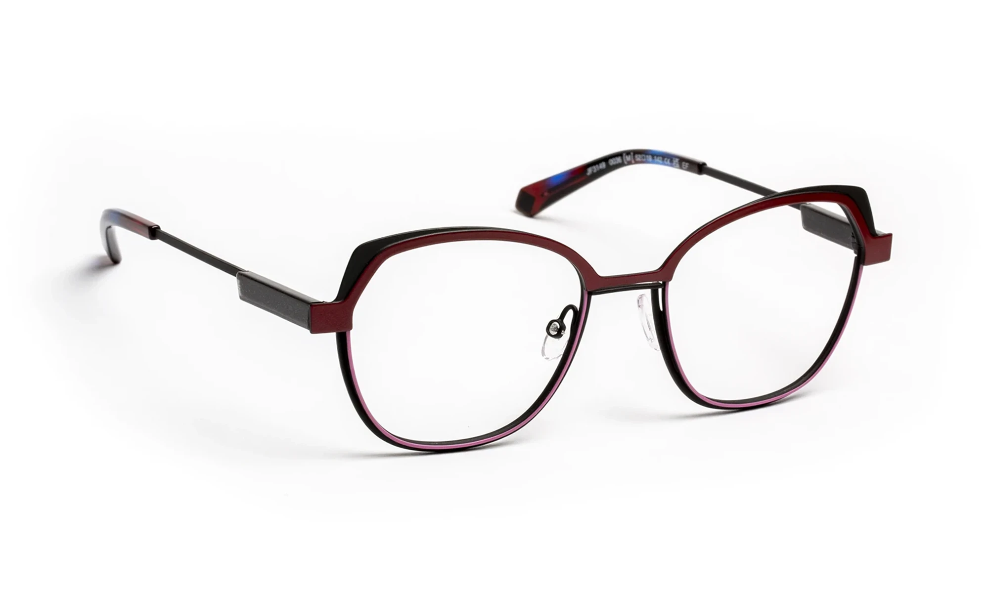 The frame combines refined, lightweight metal with graphic lines and subtle reliefs. Three harmonious colors enhance the front, while the thin temples feature an acetate detail that adds an elegant signature. The result is a modern, lightweight, and sophisticated style where materials and tones echo one another with precision.