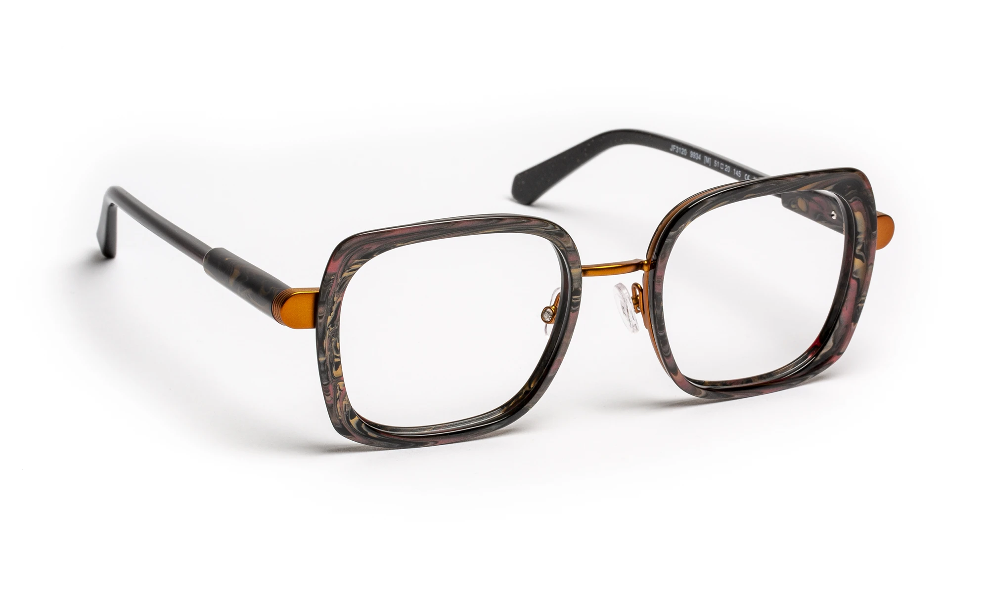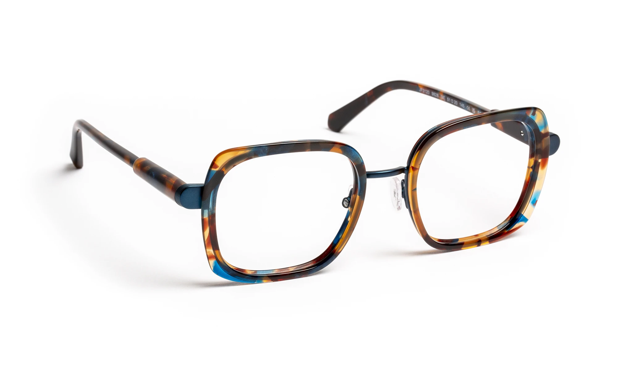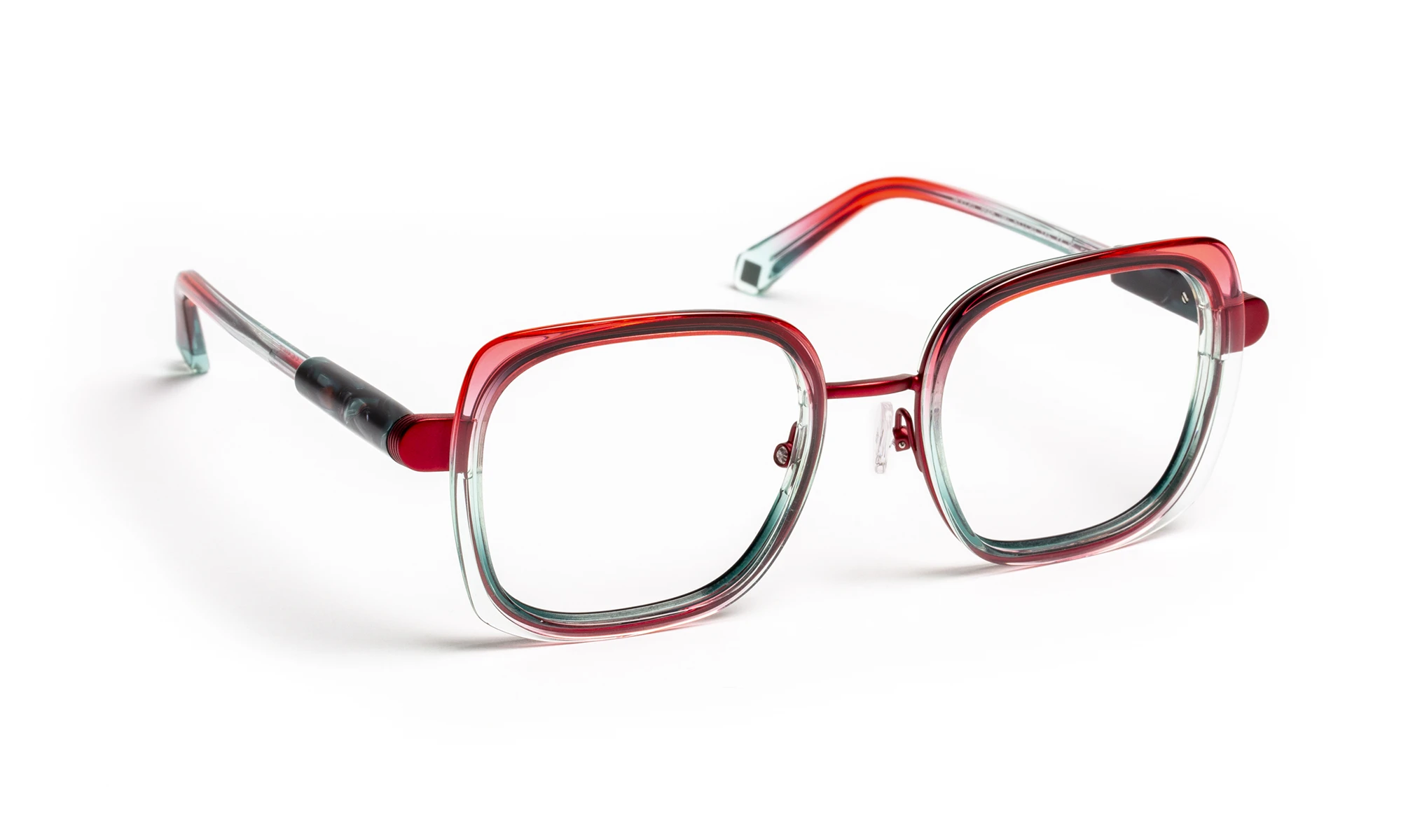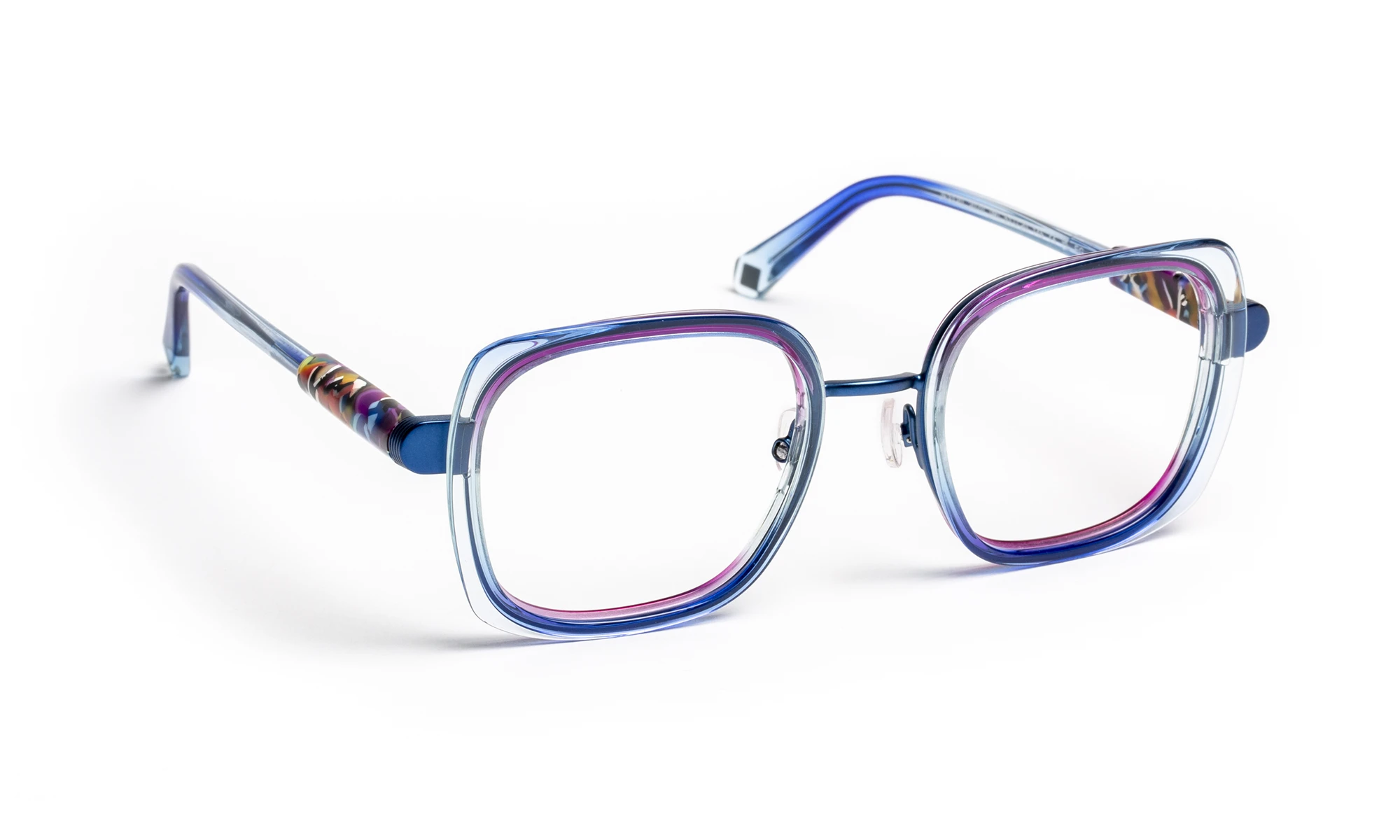 Né d’un dialogue entre métal et acétate, ce modèle unit matière et lumière dans un jeu d’équilibre raffiné. La face en métal enveloppe des cercles biseautés qui captent la transparence, tandis que les branches en acétate révèlent des reflets changeants.